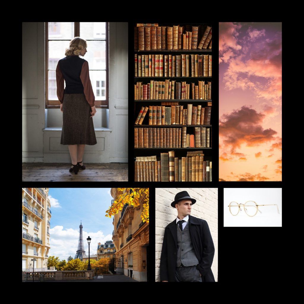 Collection of images used as inspiration for the cover. Image credits: Girl – rjenkins.co.uk; Sky – Dewang Gupta via Unsplash; Books, Paris, Man, and Glasses – Shutterstock.